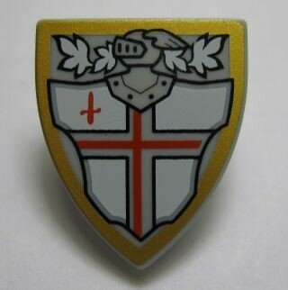 Minifiguur, driehoekig schild met rood Sint-Joriskruis en helm met gezichtsroosterpatroon
